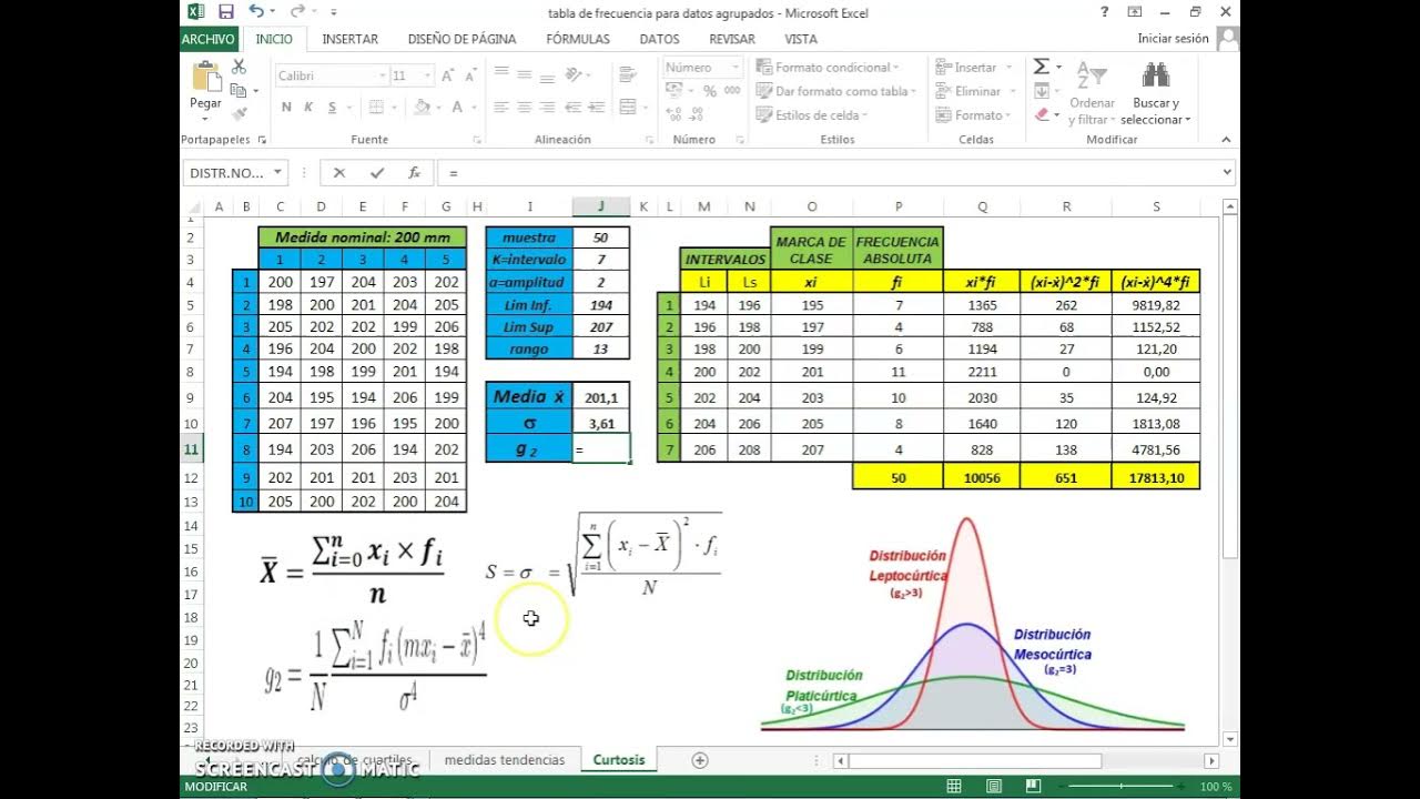 Cálculo y análisis del Coeficiente de Curtosis para datos agrupados en intervalos con Excel